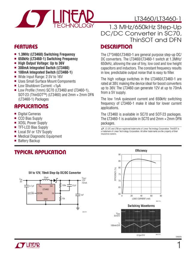 1.3 MHz/650kHz Step-Up DC/DC Converter in SC70 and ThinSOT
