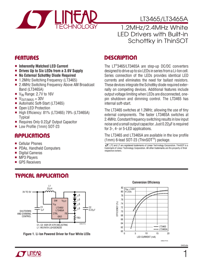 1.2MHz White LED Step-Up Converters with Built-In Schottky in ThinSOT