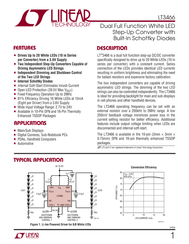 Dual Full Function White LED Step-Up Converter with Built-In Schottky Diodes