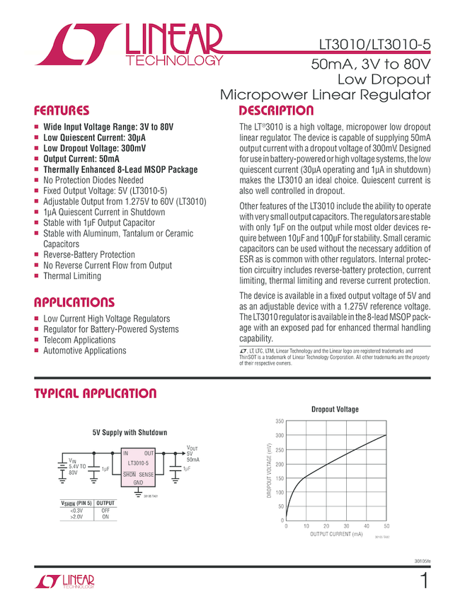 50mA, 3V to 80V Low Dropout Micropower Linear Regulator