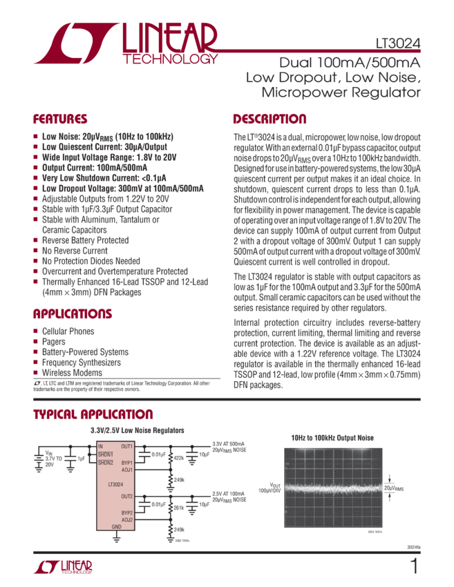 Dual 100mA/500mA Low Dropout, Low Noise, Micropower Regulator