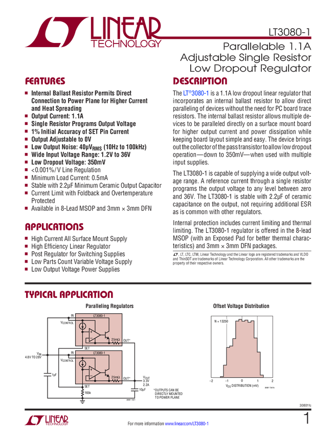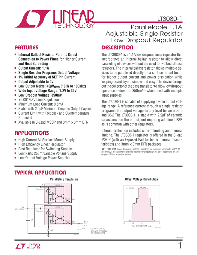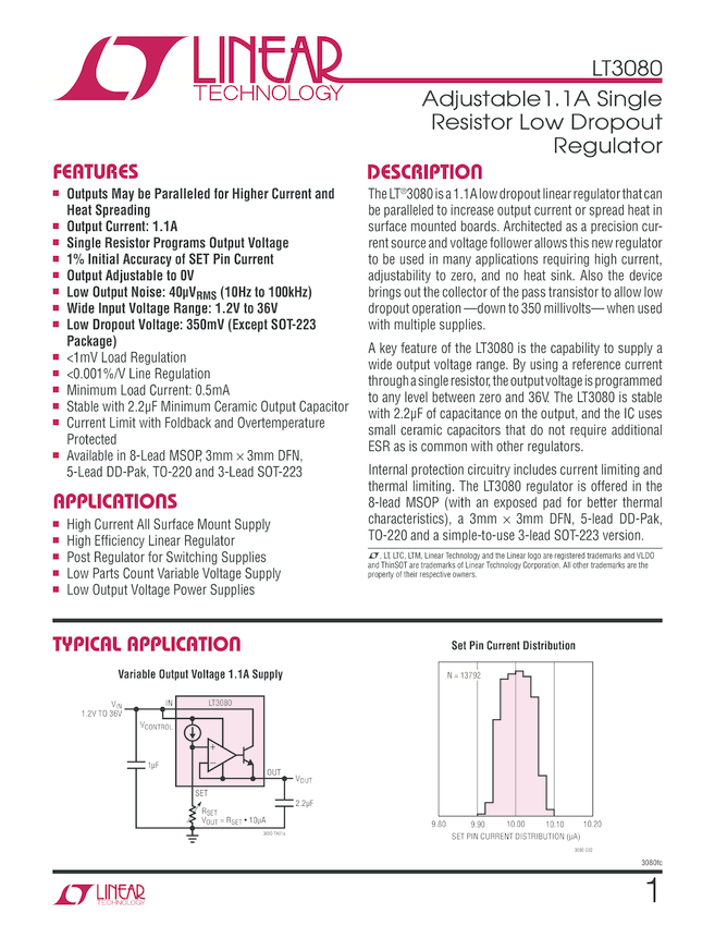 Parallelable 1.1A Adjustable Single Resistor Low Dropout Regulator