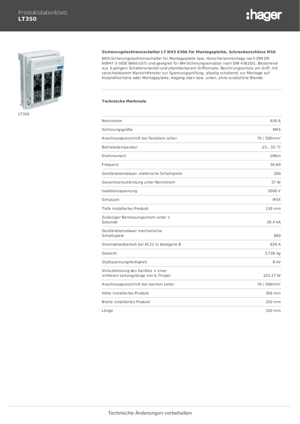Hager LT350 Rozłącznik bezpiecznikowy Rozmiar bezpiecznika = 3 630 A 1 szt.