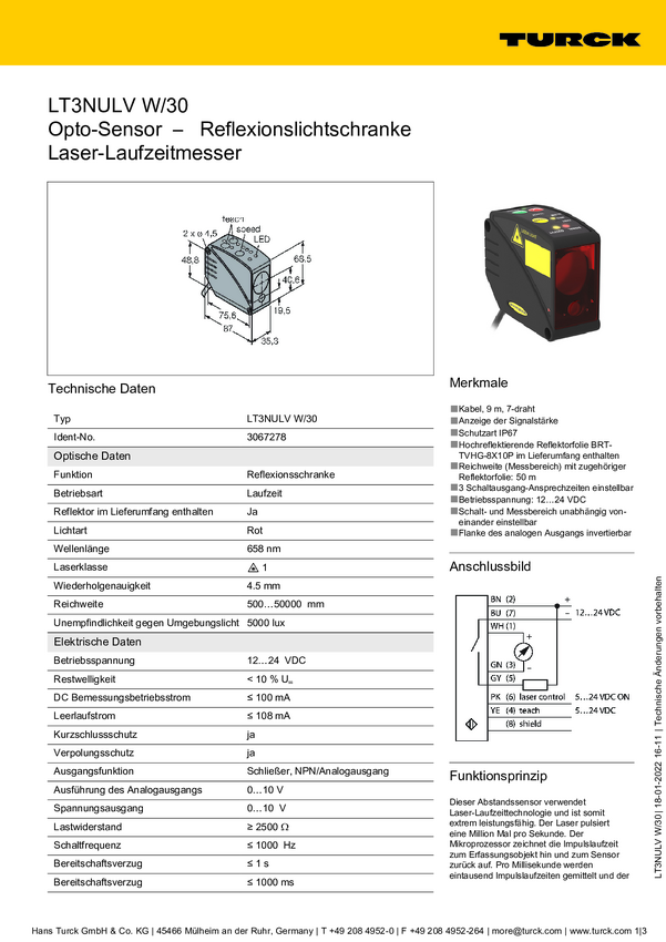 Fotokomórka odbiciowa Turck LT3NULV W/30 3067278 1 szt.