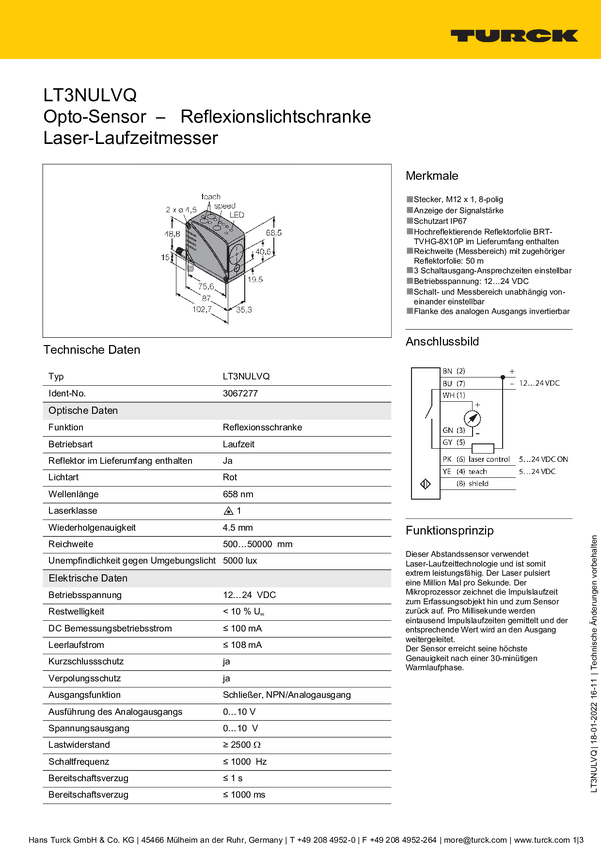 Fotokomórka odbiciowa Turck LT3NULV 3067276 1 szt.