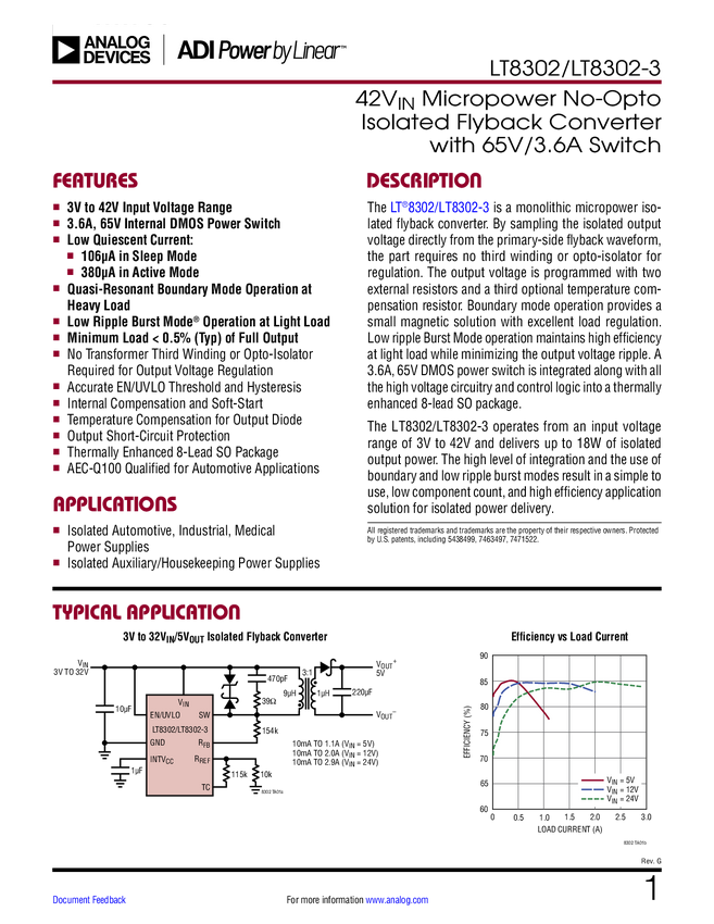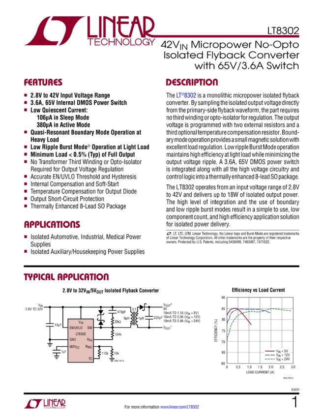 42V Micropower No-Opto Isolated Flyback Converter with 65V/3.6A Switch