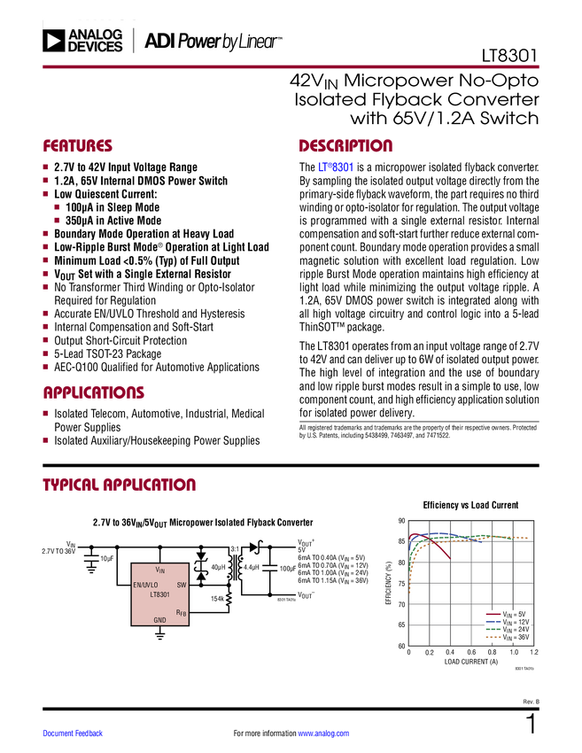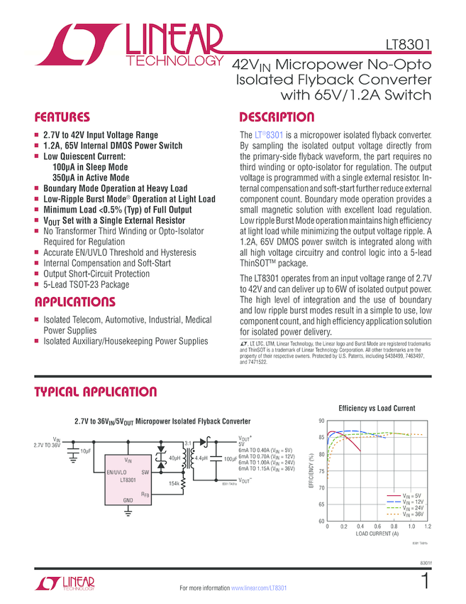 42VIN Micropower No-Opto Isolated Flyback Converter with 65V/1.2A Switch