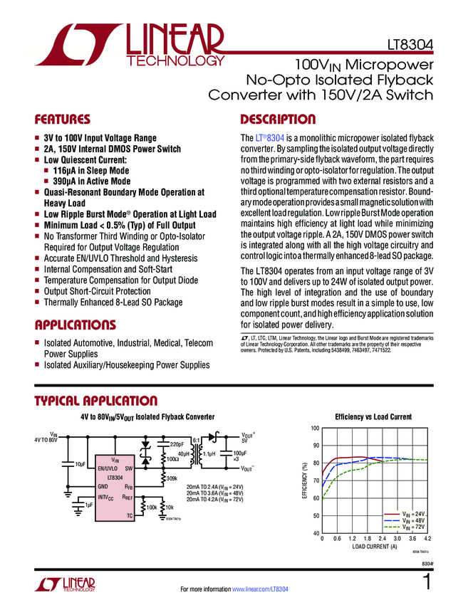 100V Micropower No-Opto Isolated Flyback Converter with 150V/2A Switch