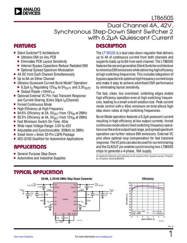Dual Channel 4A, 42V, Synchronous Step-Down Silent Switcher 2 with 6.2µA Quiescent Current