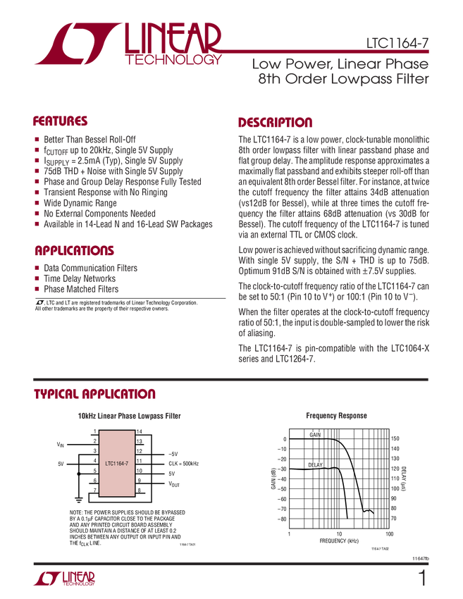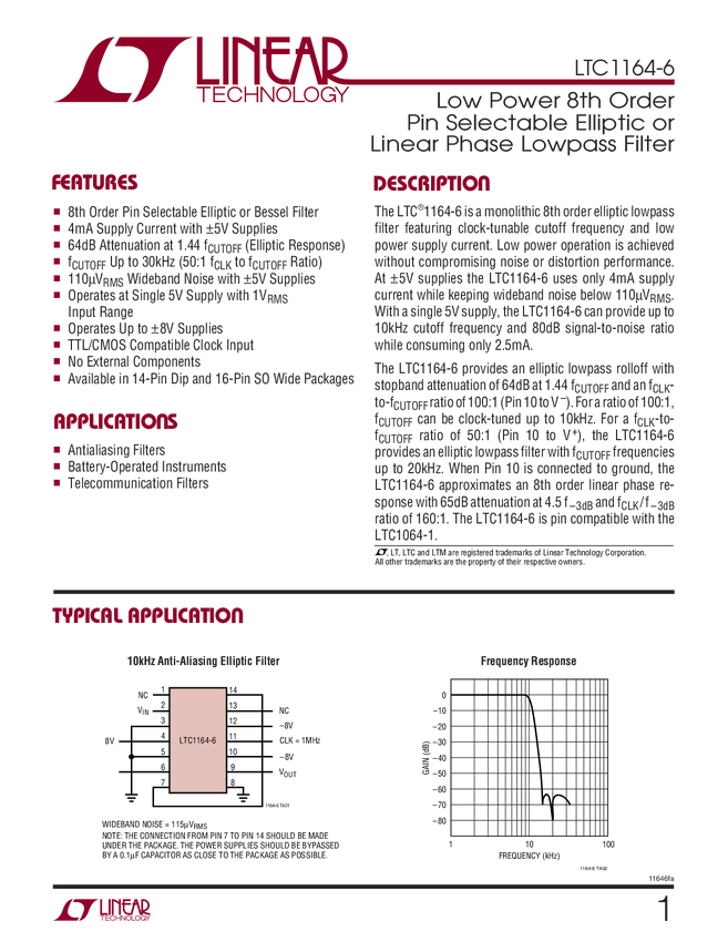 Low Power 8th Order Pin Selectable Elliptic or Linear Phase Lowpass Filter