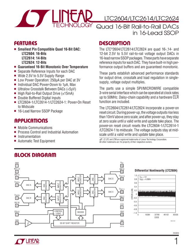Quad 16-Bit Rail-to-Rail DACs in 16-Lead SSOP