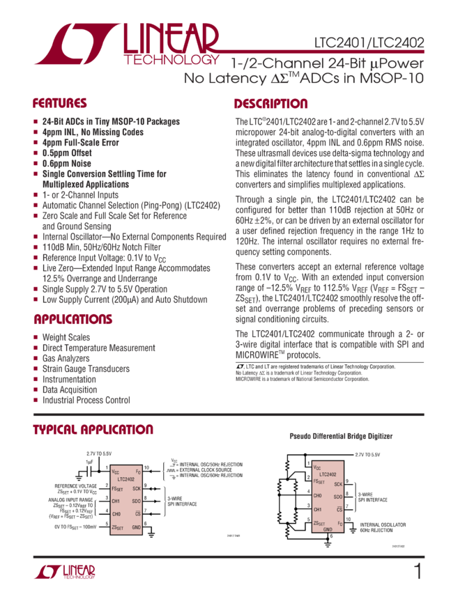 1-/2-Channel 24-Bit µPower No Latency Delta-Sigma ADC in MSOP-10