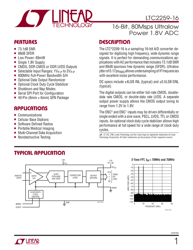 16-Bit, 80Msps Ultralow Power 1.8V ADC