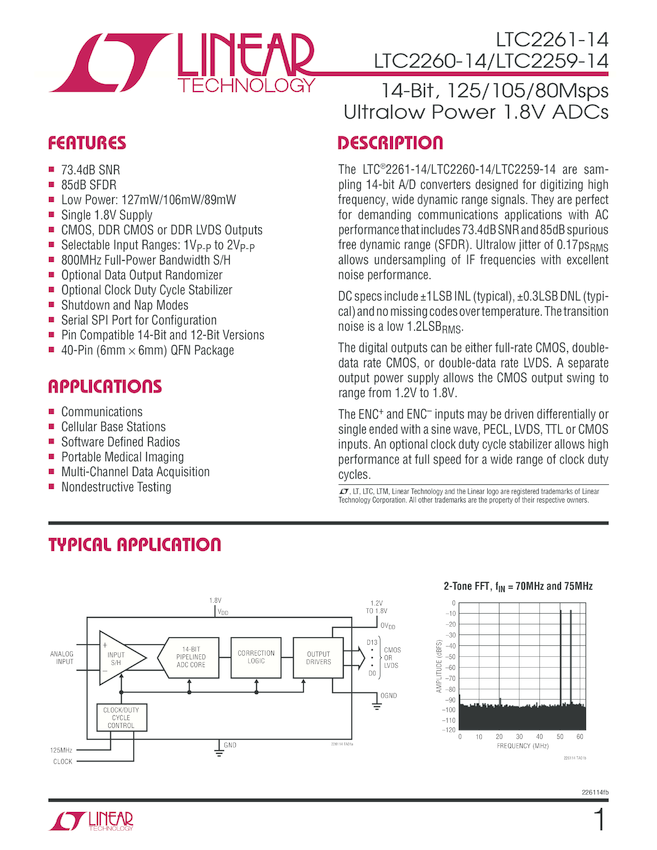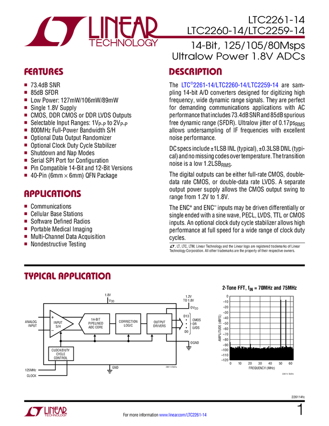 14-Bit, 80Msps Ultra-Low Power 1.8V ADCs