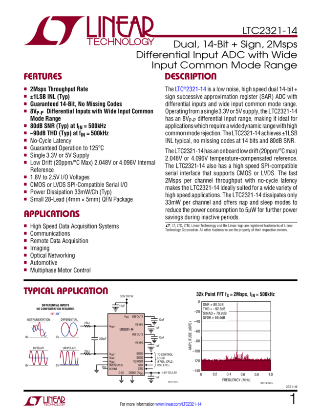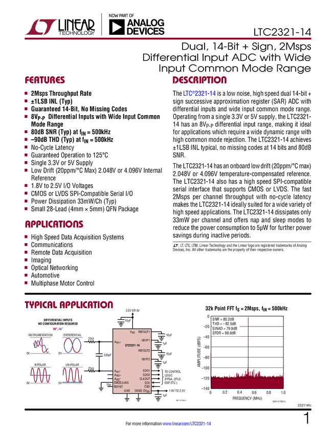 Dual, 14-Bit + Sign, 2Msps Differential Input ADC with Wide Input Common Mode Range