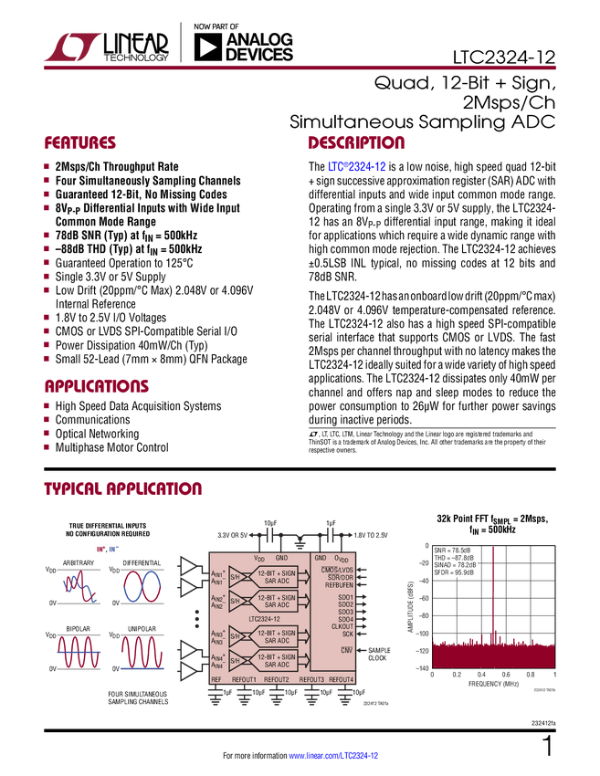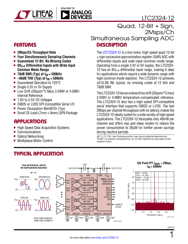 Quad, 12-Bit + Sign, 2Msps/Ch Simultaneous Sampling ADC