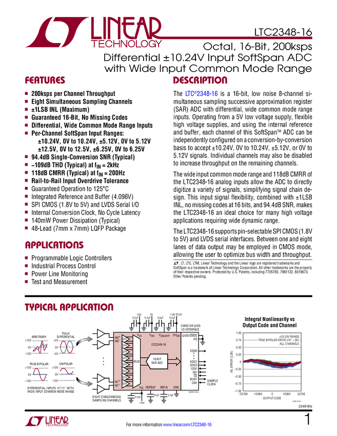 Octal, 16-Bit, 200ksps Differential ±10.24V Input SoftSpan ADC with Wide Input Common Mode Range