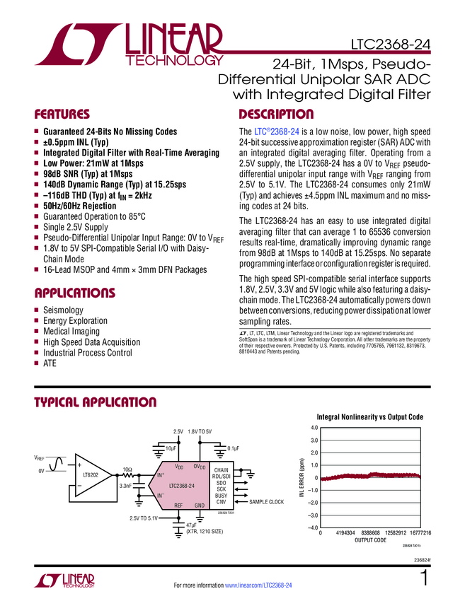 24-Bit, 1Msps, Pseudo- Differential Unipolar SAR ADC with Integrated Digital Filter