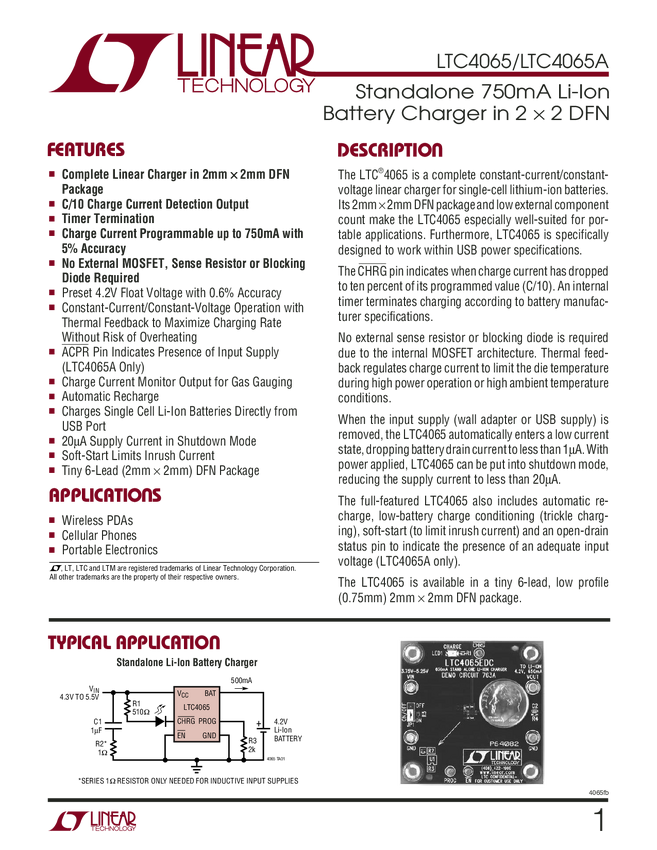 Standalone 750mA Li-Ion Battery Charger in 2 x 2 DFN