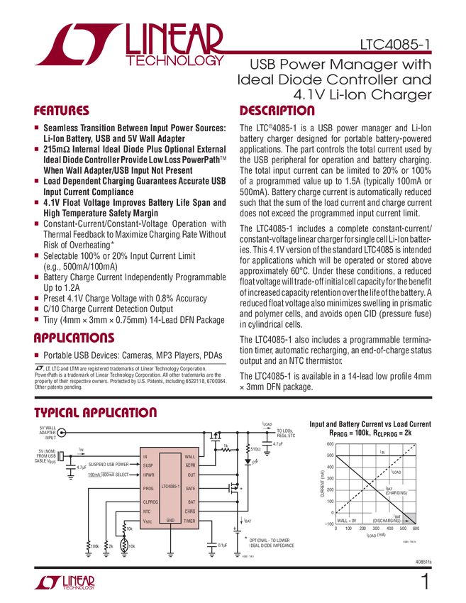 USB Power Manager with Ideal Diode Controller and 4.1V Li-Ion Charger