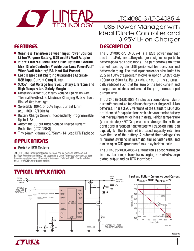 USB Power Manager with Ideal Diode Controller and 3.95V Li-Ion Charger