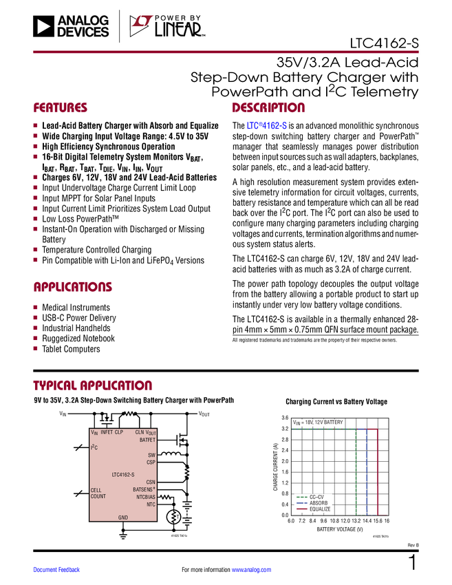 35V/3.2A Lead-Acid Step-Down Battery Charger with PowerPath and IC Telemetry