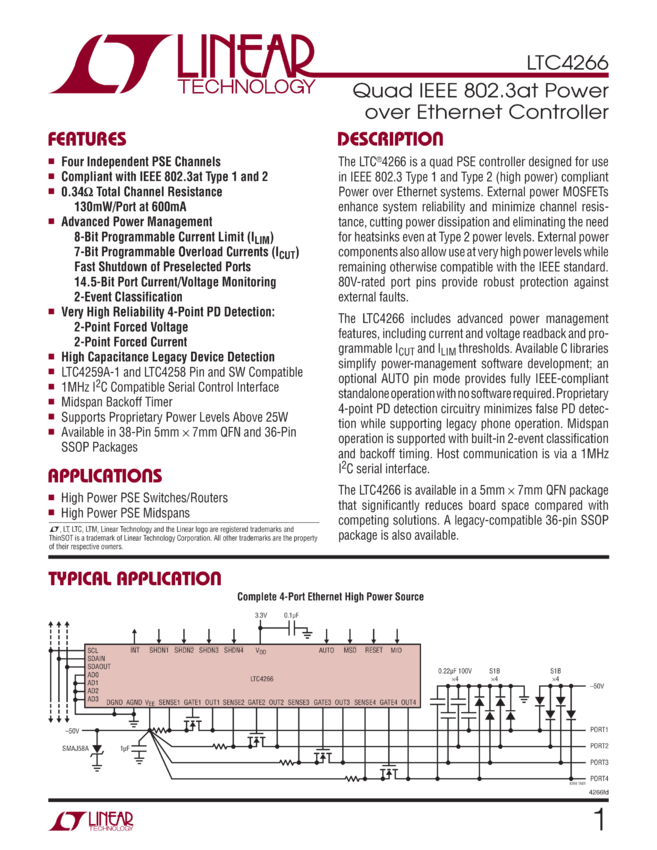 Quad IEEE 802.3at Power Over Ethernet Controller