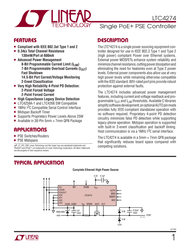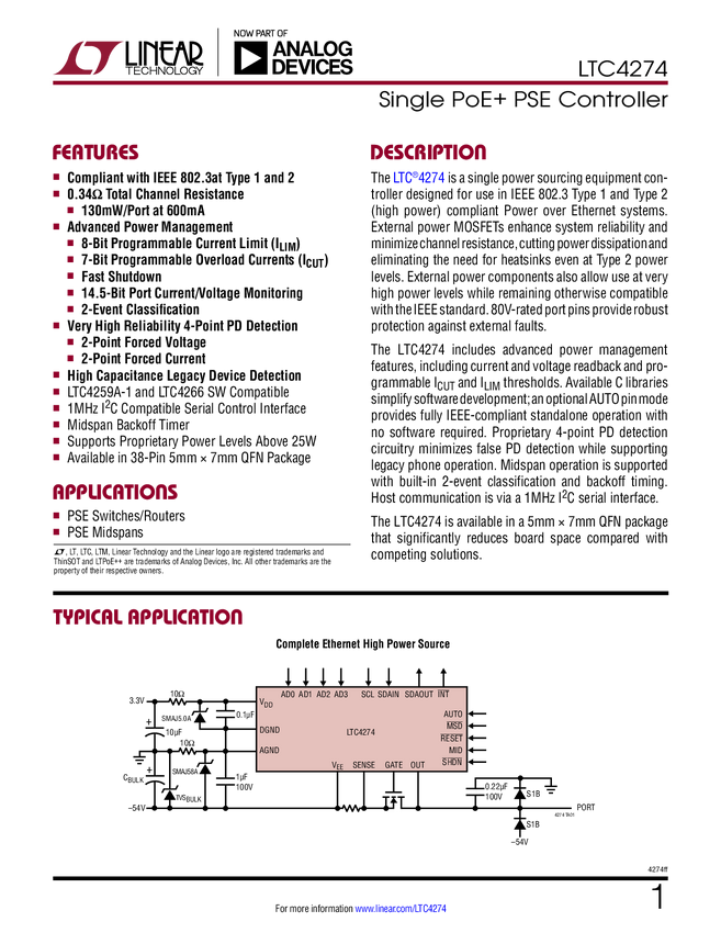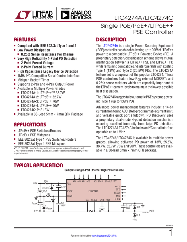 Single PoE/PoE+/LTPoE++ PSE Controller