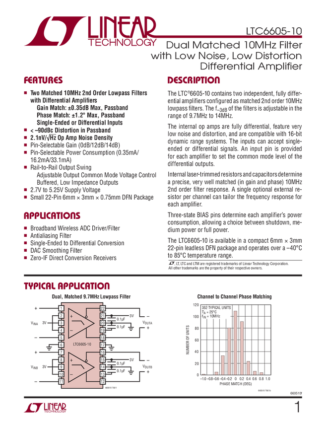 Dual Matched 14MHz Filter with Low Noise, Low Distortion Differential Amplifier