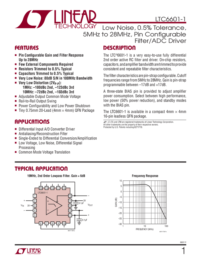 Low Noise, 0.5% Tolerance, 5MHz to 28MHz, Pin Configurable Filter/ADC Driver