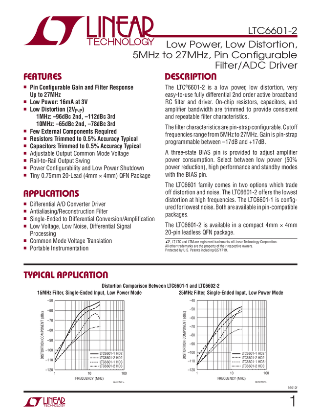 Low Power, Low Distortion, 5MHz to 27MHz, Pin Configurable Filter/ADC Driver