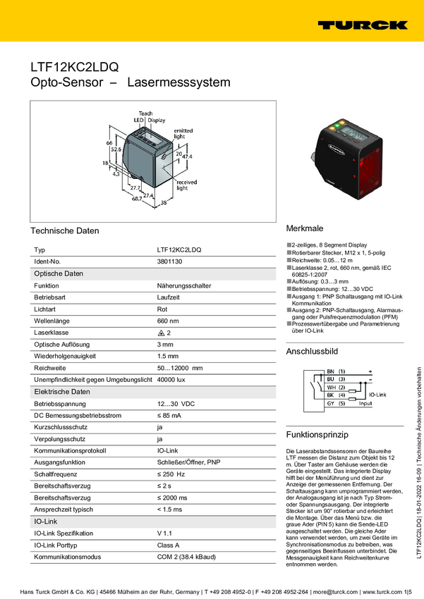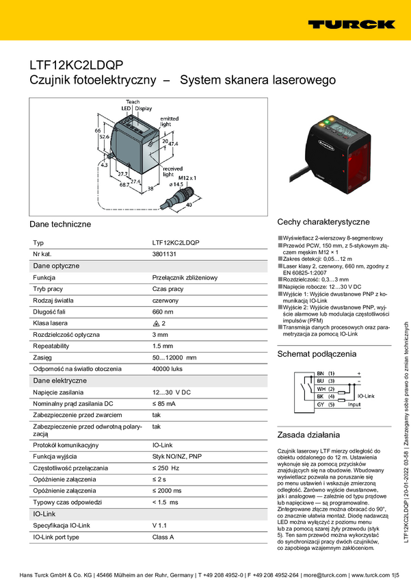 Turck Czujnik odległości PNP, Zamykający LTF12KC2LDQP