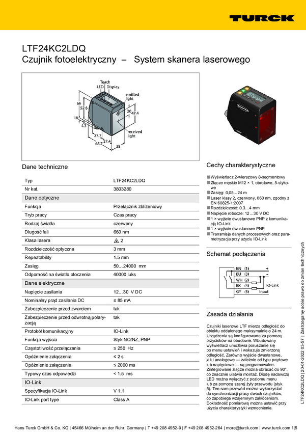Turck Czujnik odległości PNP, Zamykający LTF24KC2LDQ
