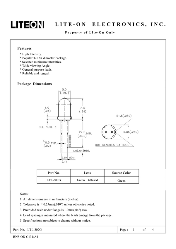 Dioda LED THT Lite-On LTL307E LTL307E, 5 mm, 19 mcd, 1 szt.