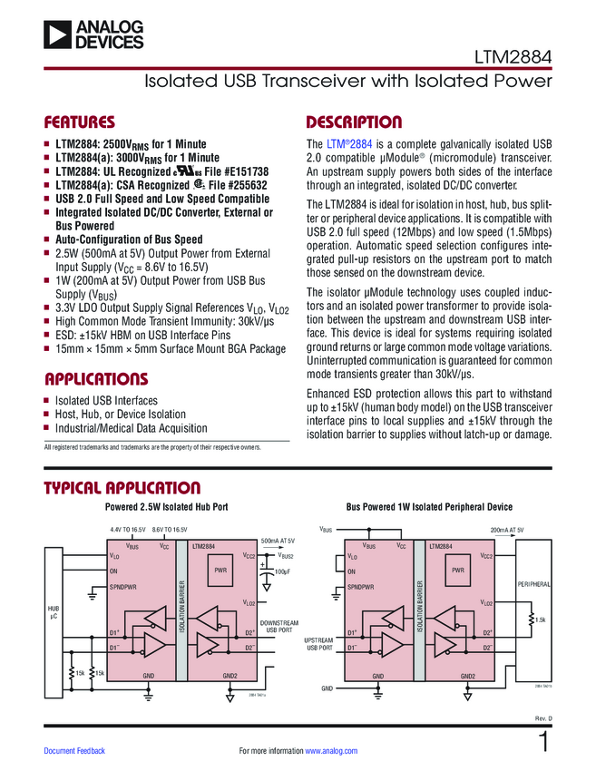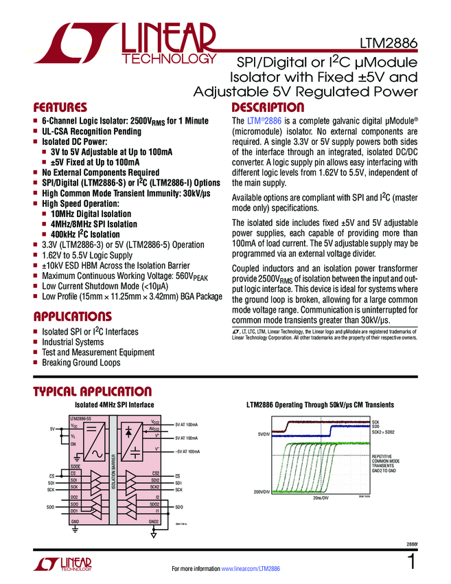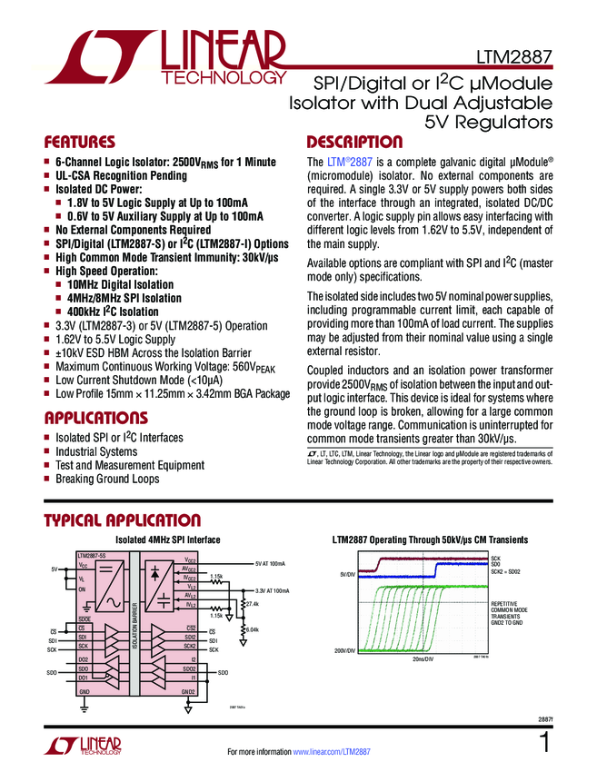 SPI/Digital or I2C μModule Isolator with Dual Adjustable 5V Regulators