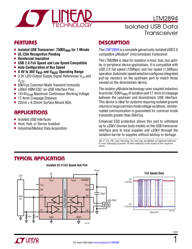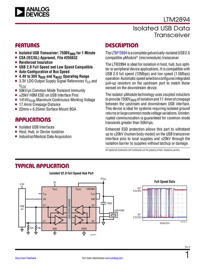6500 VRMS Isolated RS485/RS422 μModule Transceiver + Power
