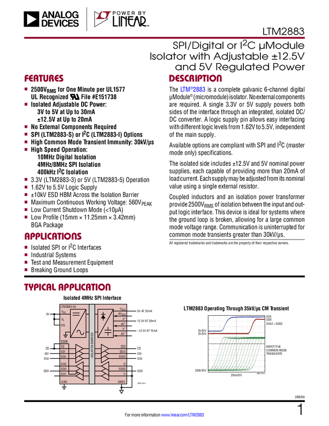 SPI/Digital or I2C μModule Isolator with Adjustable ±12.5V and 5V Regulated Power