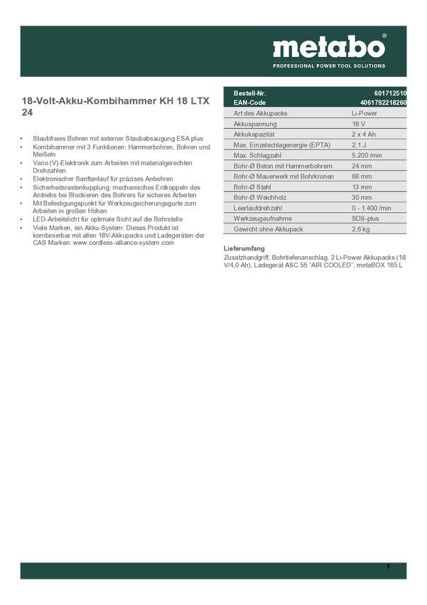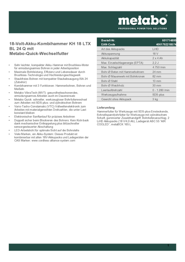 Młot wielofunkcyjny, akumulatorowy Metabo KH 18 LTX BL 24 Q 601714800 1 szt.