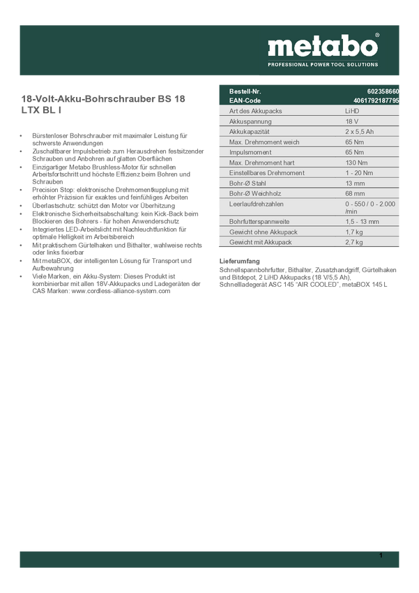 Wiertarko-wkrętarka akumulatorowa Metabo BS 18 LTX BL I 602358660 18 V 5.5 Ah