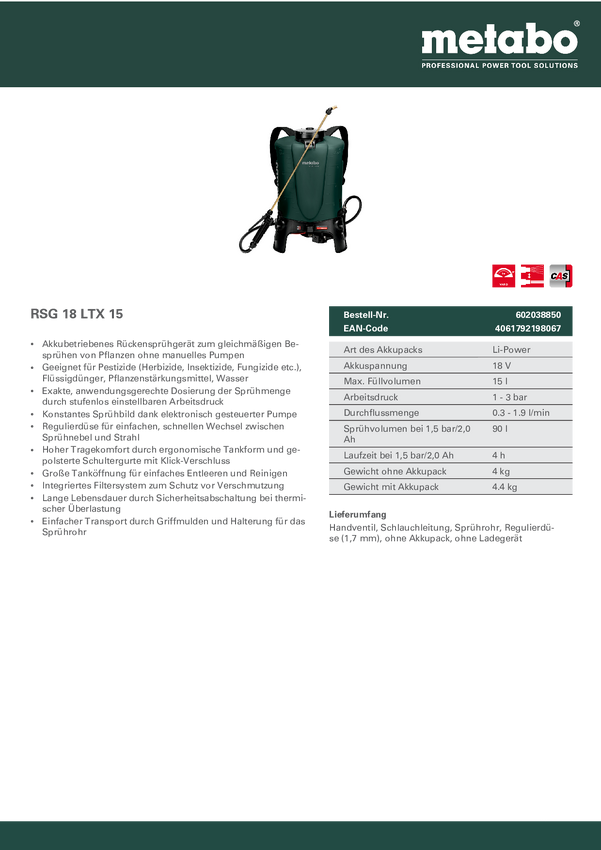Zestaw do opryskiwania Metabo RSG 18 LTX 15