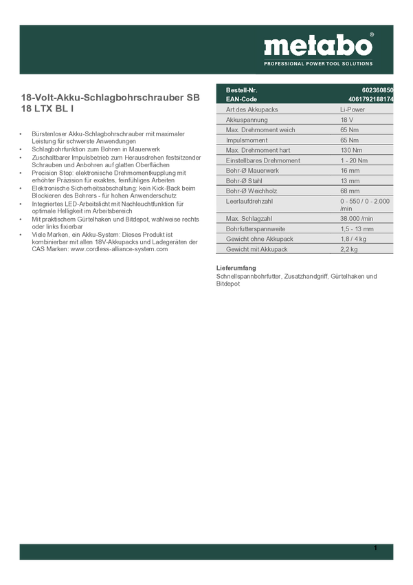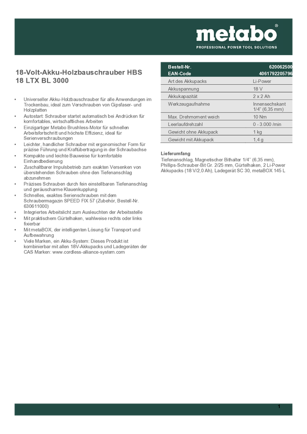 Wiertarko-wkrętarka akumulatorowa Metabo HBS 18 LTX BL 3000 620062500 18 V 2.0 Ah