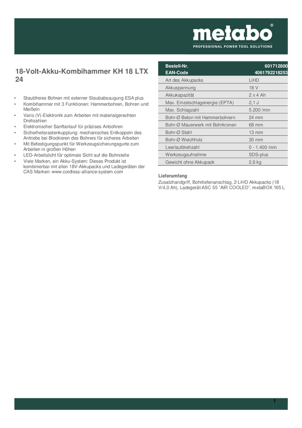 Młot wielofunkcyjny, akumulatorowy Metabo KH 18 LTX 24 601712800 1 szt.
