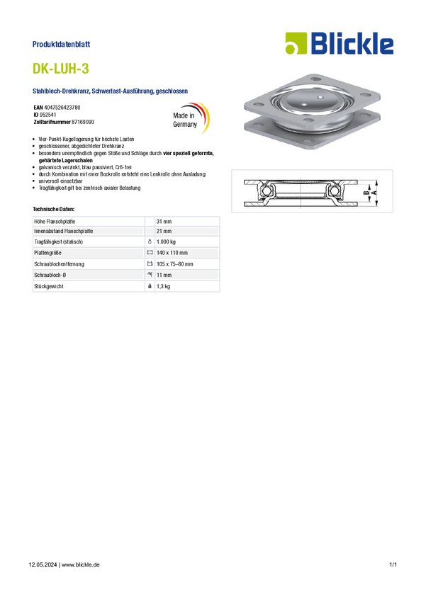 Blickle 952541 DK-LUH-3 Pierścień obrotowy z blachy stalowej 1 szt.