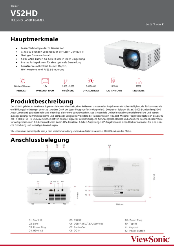 Viewsonic Rzutnik V52HD Laser ANSI-Lumen: 5000 ANSI lumenów 1920 x 1080 Full HD 3000000 : 1 biały