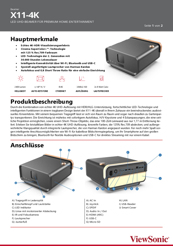 Viewsonic Rzutnik X11-4K LED ANSI-Lumen: 1000 ANSI lumenów 3840 x 2160 UHD 4K 3000000 : 1 szary