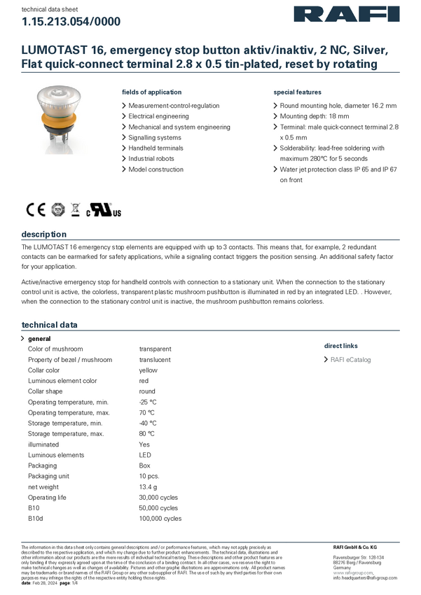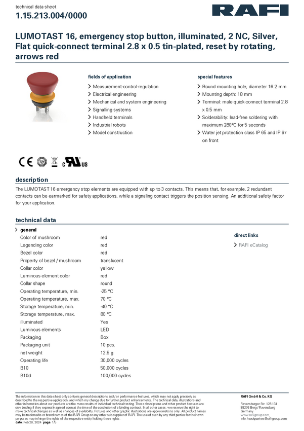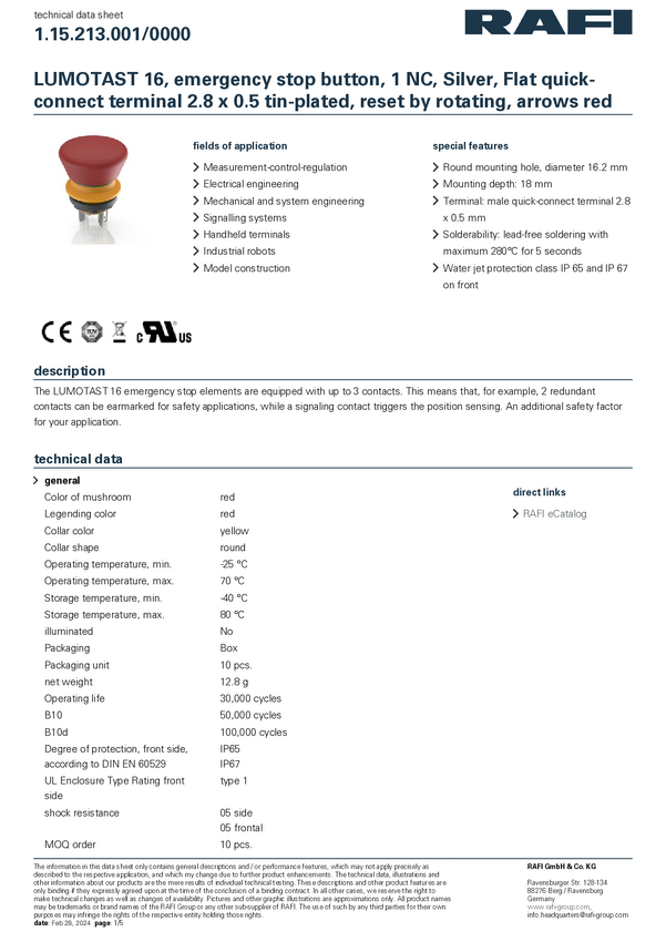 RAFI 1.15.213.001/0000 Wyłącznik awaryjny LUMOTAST 16, 1 NC, 1 szt.