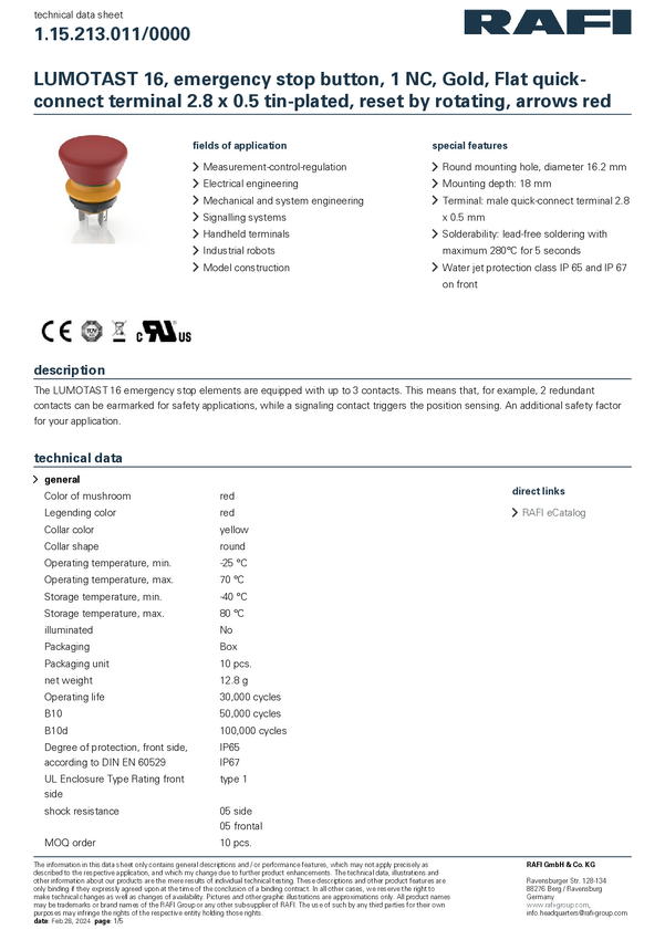 RAFI 1.15.213.011/0000 Wyłącznik awaryjny LUMOTAST 16, 30 V, 1 NC, 1 szt.