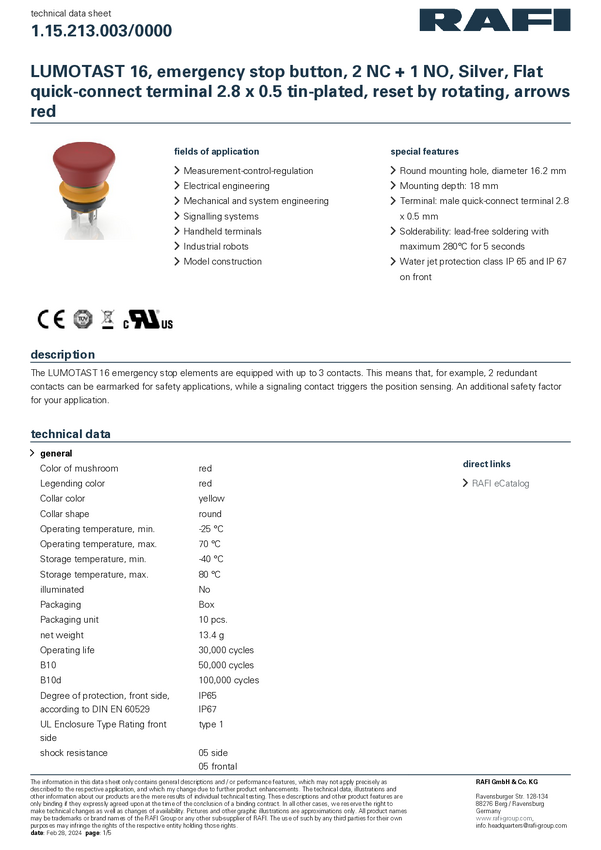 RAFI 1.15.213.004/0000 Wyłącznik awaryjny LUMOTAST 16, 2 NC, 1 szt.