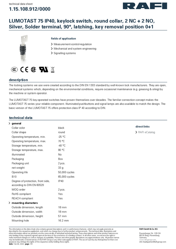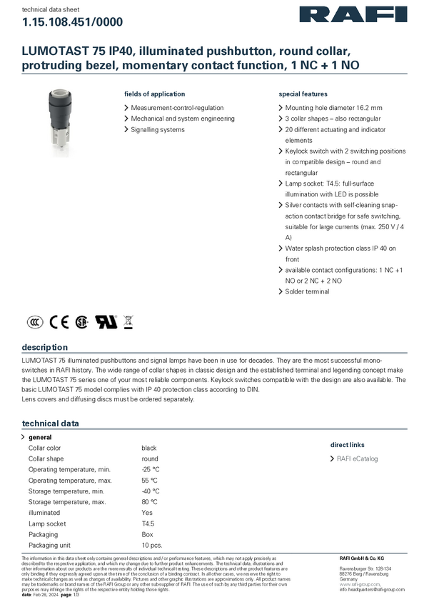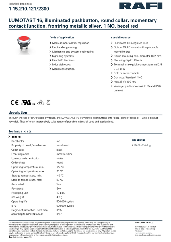 RAFI 1.15.213.002/0000 Przycisk LUMOTAST 16, 2 NC, 1 szt.