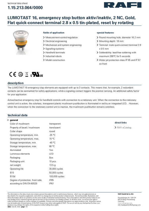 RAFI 1.15.213.014/0000 Wyłącznik awaryjny LUMOTAST 16, 35 V, 2 NC, 1 szt.